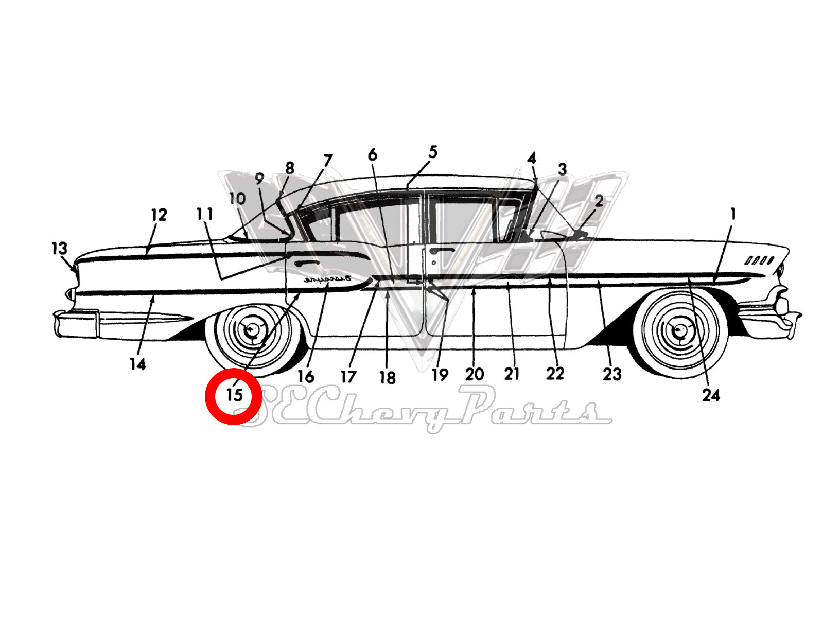 1958 Chevy 4 Door Delray Left Rear Door Rear Trim Molding RESTORED
