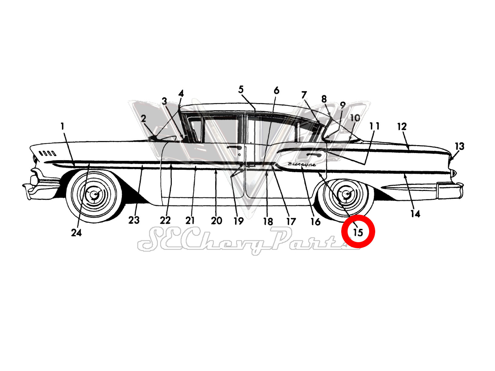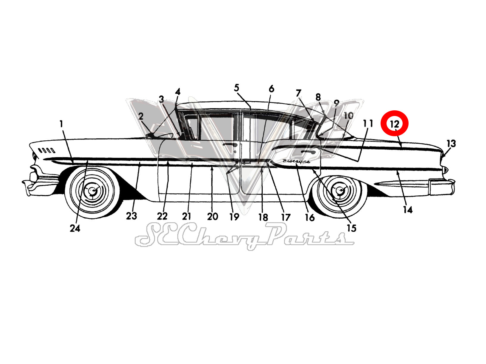 1958 Chevy Biscayne Brookwood NOS RIGHT Lower Fender Molding #3759422 #3749312