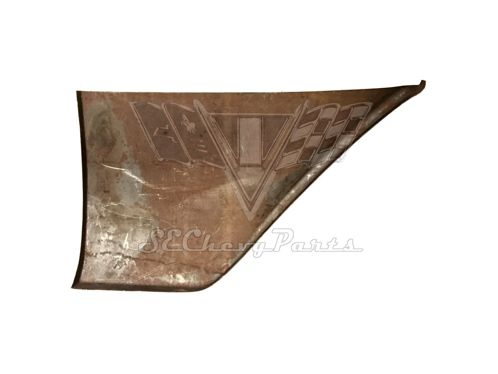 This 1956 Chevy Bel Air Lower Front Fender Patch Panel RIGHT is a reproduction of the original. This is old inventory that has been sitting on the shelf. There may be shelf-wear with minor dings and dents but they have never been installed.