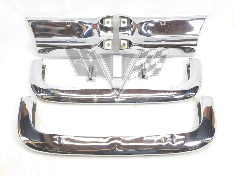 This 1957 Chevrolet Continental Kit is a used GM six piece set. Recently removed from a 1957 car, the lower bar has scratches and scuffs on the underside, but otherwise it is in good condition. This continental kit has the chrome bumper sections, the spare tire bumpers, and the spacers.