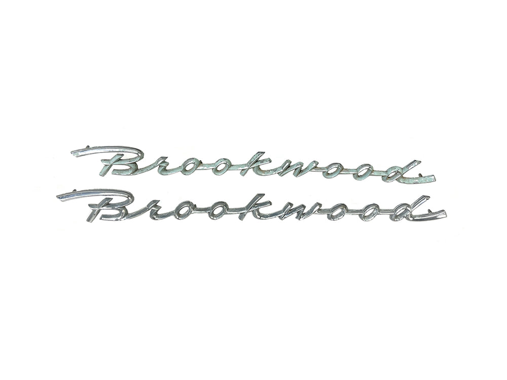This pair of 1958-1959 Chevy Brookwood Wagon Rear Door Scripts is an original used GM set. There is some pitting but all the pins are good to install. Can be re-plated for show quality.