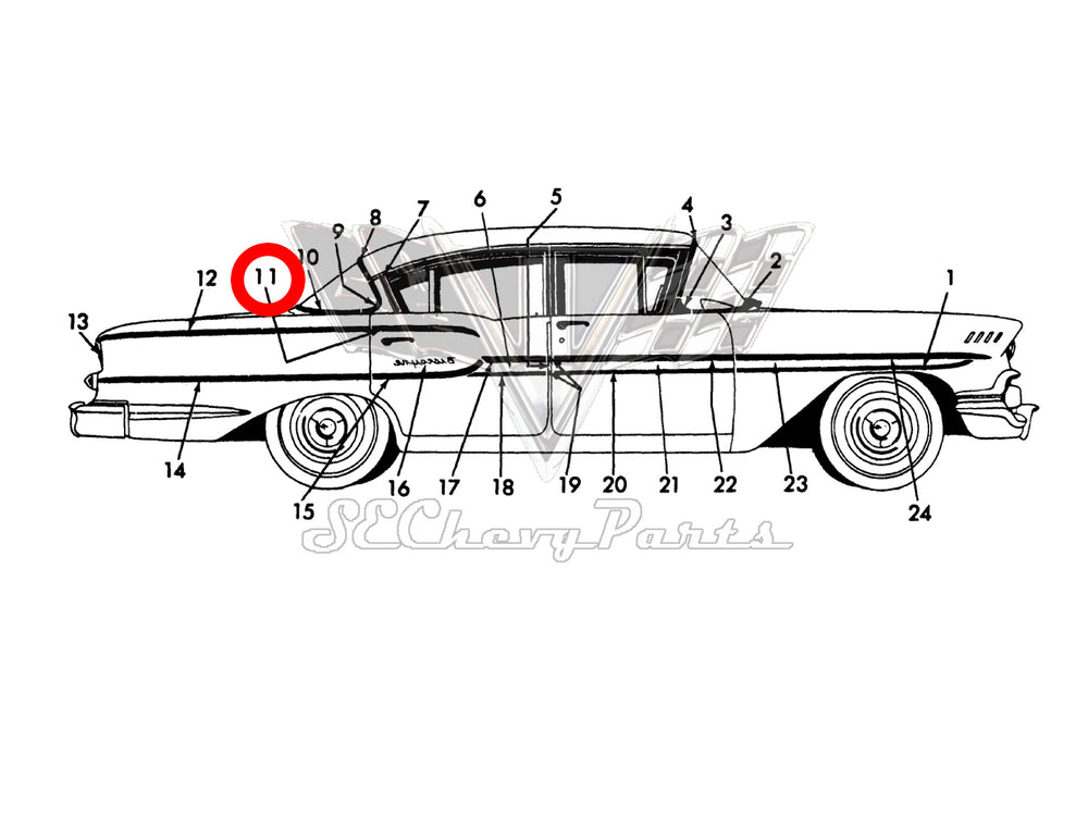 This 1958 Chevy 4 Door Biscayne Delray Right/Passenger's Side Rear Door Upper Quarter Trim Molding is an original GM part that has been professionally polished to SHOW QUALITY. Also fits 1958 4 Door Yoeman and Brookwood Wagons.