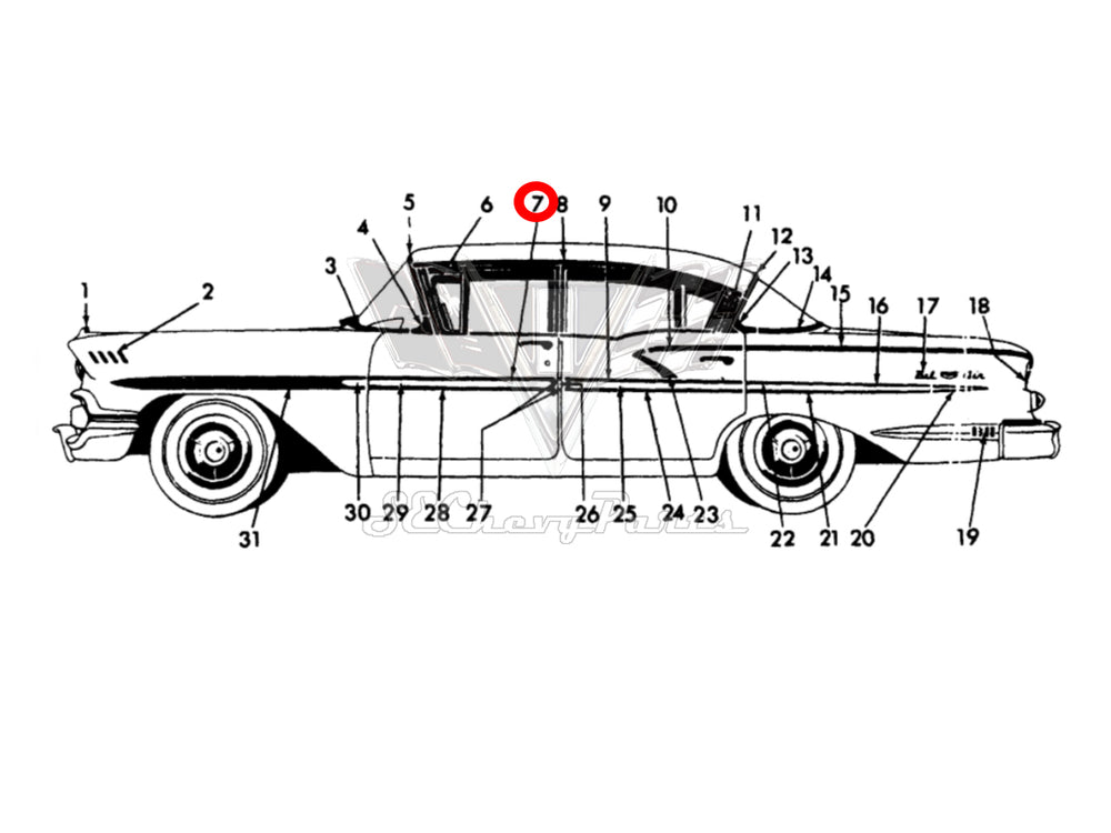 This 1958 Chevy Bel Air 4-Door Front LEFT UPPER or RIGHT LOWER Molding is an original NOS GM part #3759491. It is in good condition with some shelfware. NOTE: The driver's side upper molding is the same as the passenger's side lower.