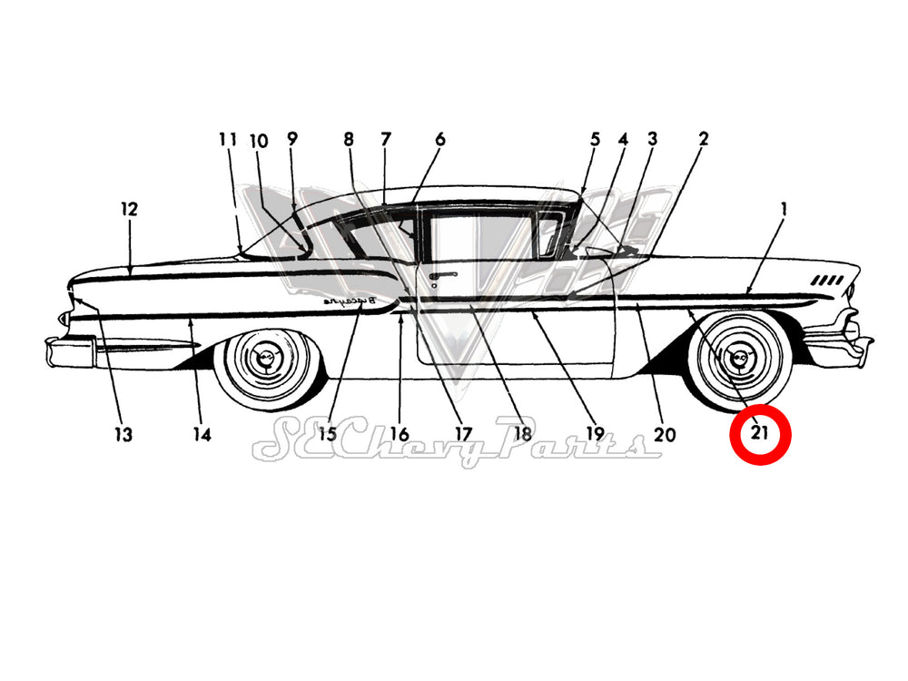 This 1958 Chevy Biscayne NOS RIGHT/PASSENGER'S SIDE Lower Fender Molding is an original GM part #3759422 #3749312. Some moldings still have the original wrapping and may have some shelf ware. These are not show pieces