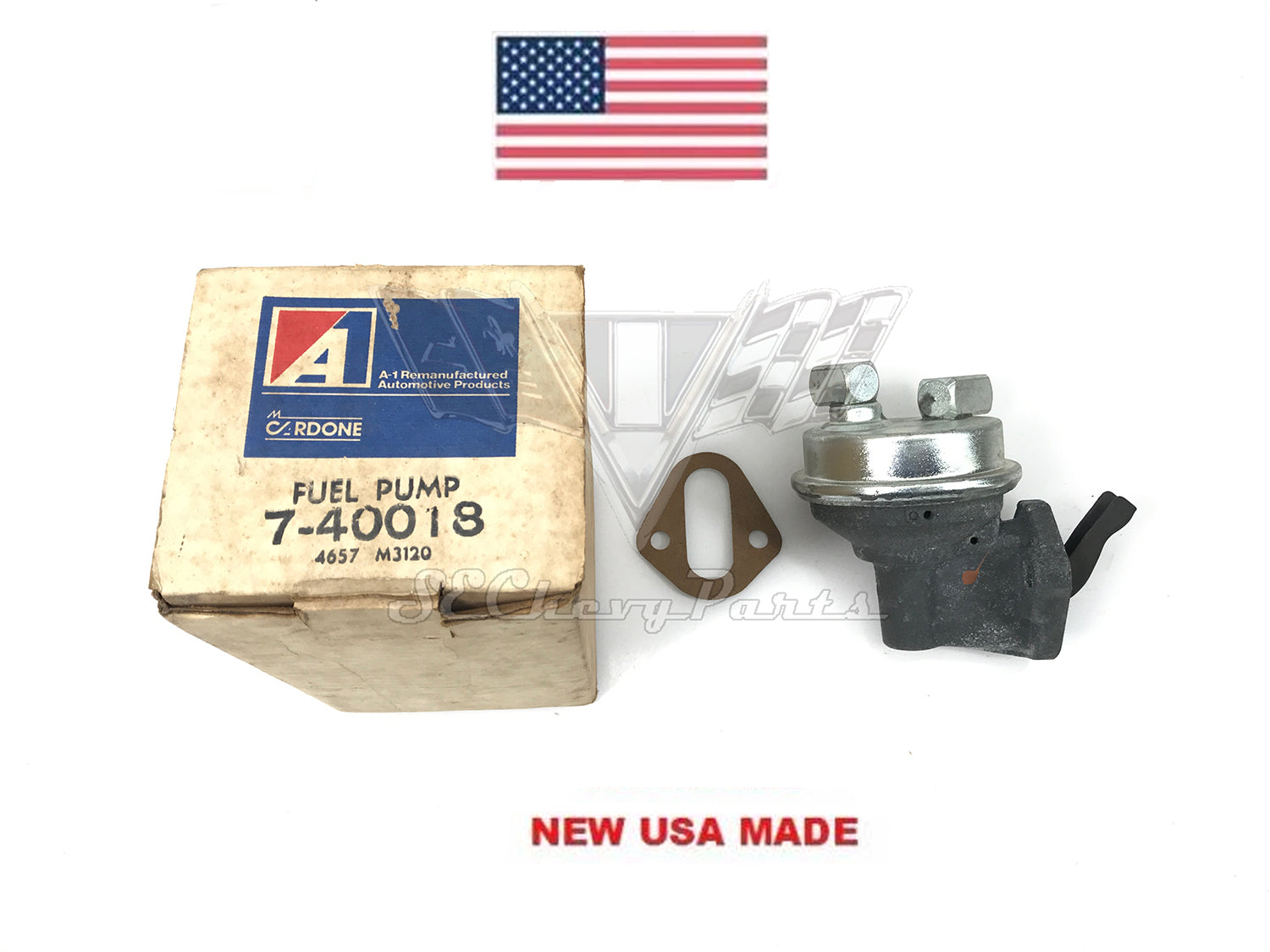 This 1959-1966 Chevy V8 Fuel Pump (283 327 348 350 409) is a Cardone remanufactured part #7-40018 (4657). These are old stock items so the appearance my not be in pristine condition but they will come with installation instructions and a gasket.