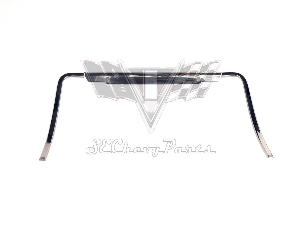 This 1959 Chevy Accessory License Plate Molding Set is an original set that has been fully restored. There are three pieces to complete the set. The mounting screws are NOT included. This is also known as a Rear Pocket Guard. The center molding even has the slight bubble in the center.