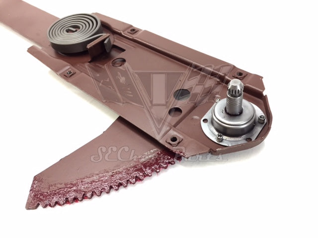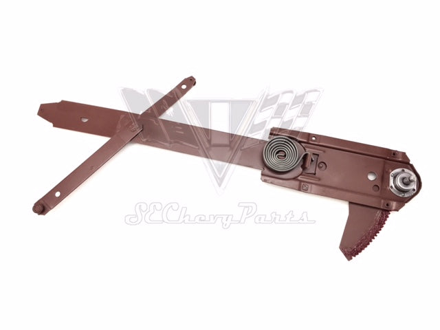 These original 1961-1962-1963-1964 Chevrolet Hardtop, Convertible, or Sedan RIGHT/PASSENGER'S SIDE door window regulators have been fully restored. The door window regulators also fit a 1961-1964 Buick, Pontiac & Oldsmobile. We replace any gears or nylon rollers that are broken or worn down. Often the springs are broken or the main rivet is loose causing the regulator to fail to raise the window all the way up. In this case, we install new springs or rivets so as to ensure that the regulator will work properly. When we get done with them they look and function like new.