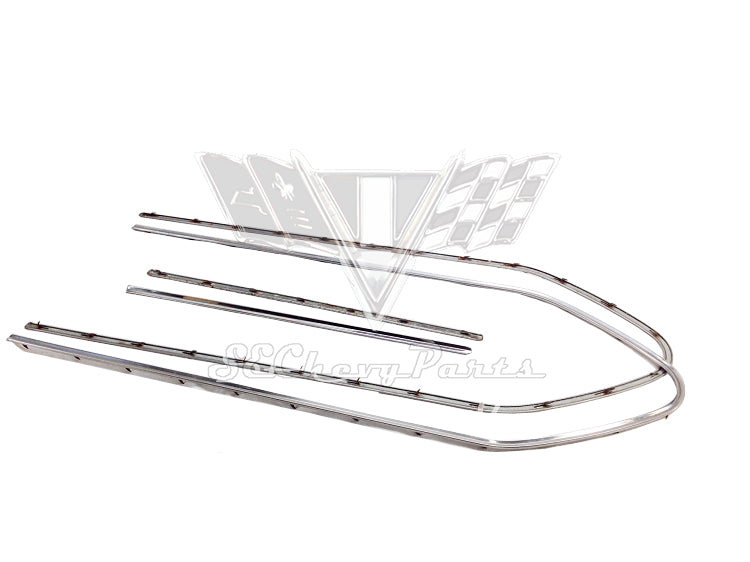 These 1961 Chevrolet Bel Air 2 Door Hardtop Door Panel Stainless are original used GM parts. This is a full set in good condition and includes the front door and rear quarter moldings (4 pieces). Nearly all the tabs are in good working condition.