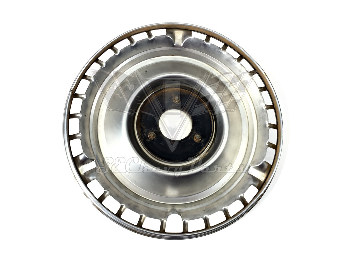 This 1961 Chevy Impala SS Super Sport Hubcaps is an original GM used part. These are extremely rare original spinners and not the aftermarket. You can tell by the backside of the spinner (see photo). The spinners are in decent shape with pitting (see photo) and not intended for a show car.