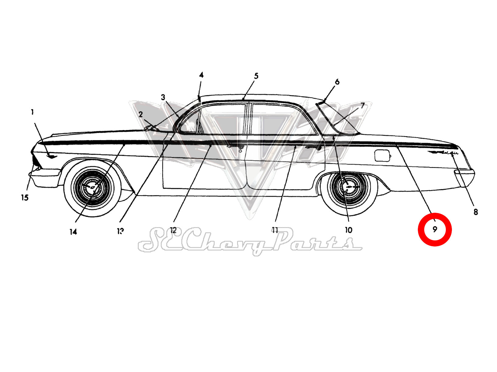 This 1962 Chevy Bel Air 4-Door NOS LEFT/DRIVER'S SIDE Rear Quarter Molding is an original GM part #3817123. Some moldings still have the original wrapping and may have some shelf ware. These are not show pieces