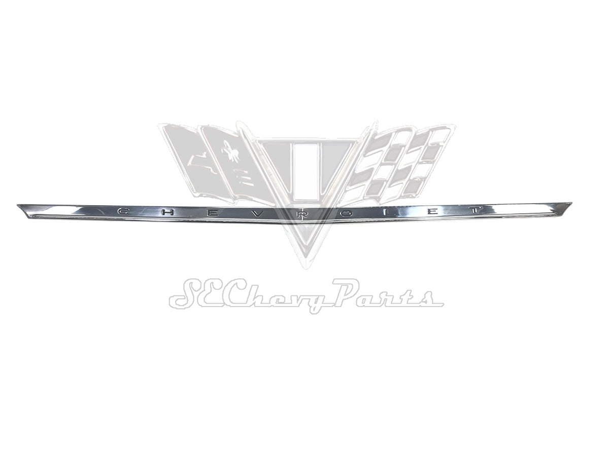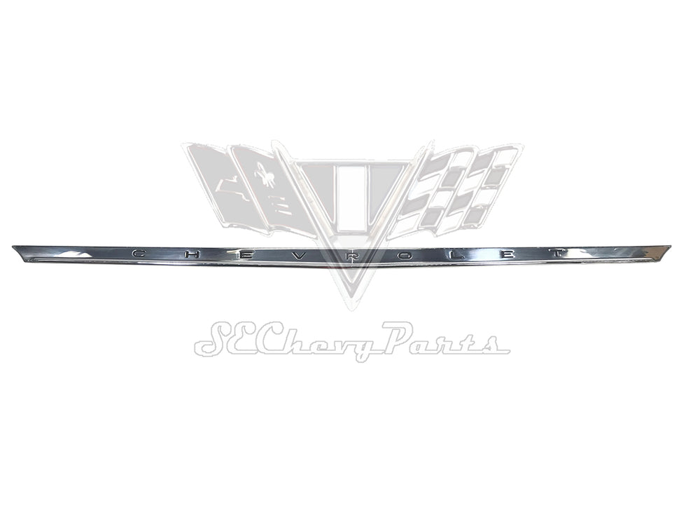 This 1962 Chevy Impala Hood Edge Lip Molding Trim is an original GM part that has been re-anodized. The letters have been painted and the backing plate re-installed.