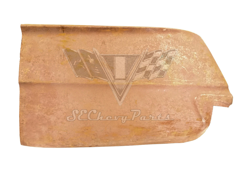 This 1962 Chevy Impala Rear Quarter Patch Panel is a reproduction sheet metal piece. This is old inventory that has been sitting on the shelf. There may be shelf-wear with minor dings and dents but they have never been installed.