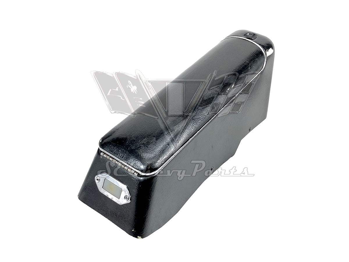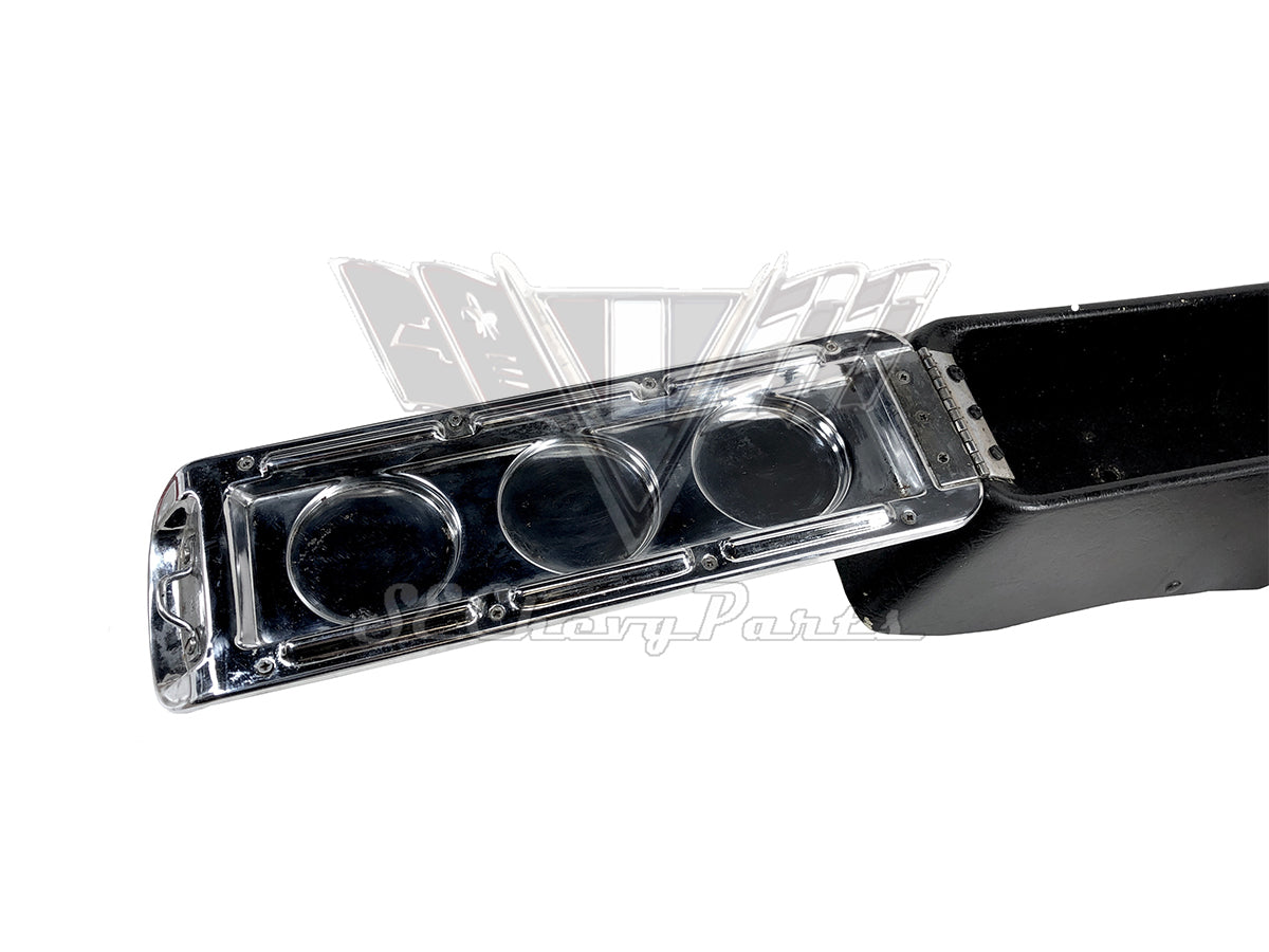 This 1962 Chevy Impala Super Sport Center Console is an original GM part that is in great condition. The chrome and vinyl are very nice but not perfect. The inner latch functions but the tumbler is missing and would need to be replaced.