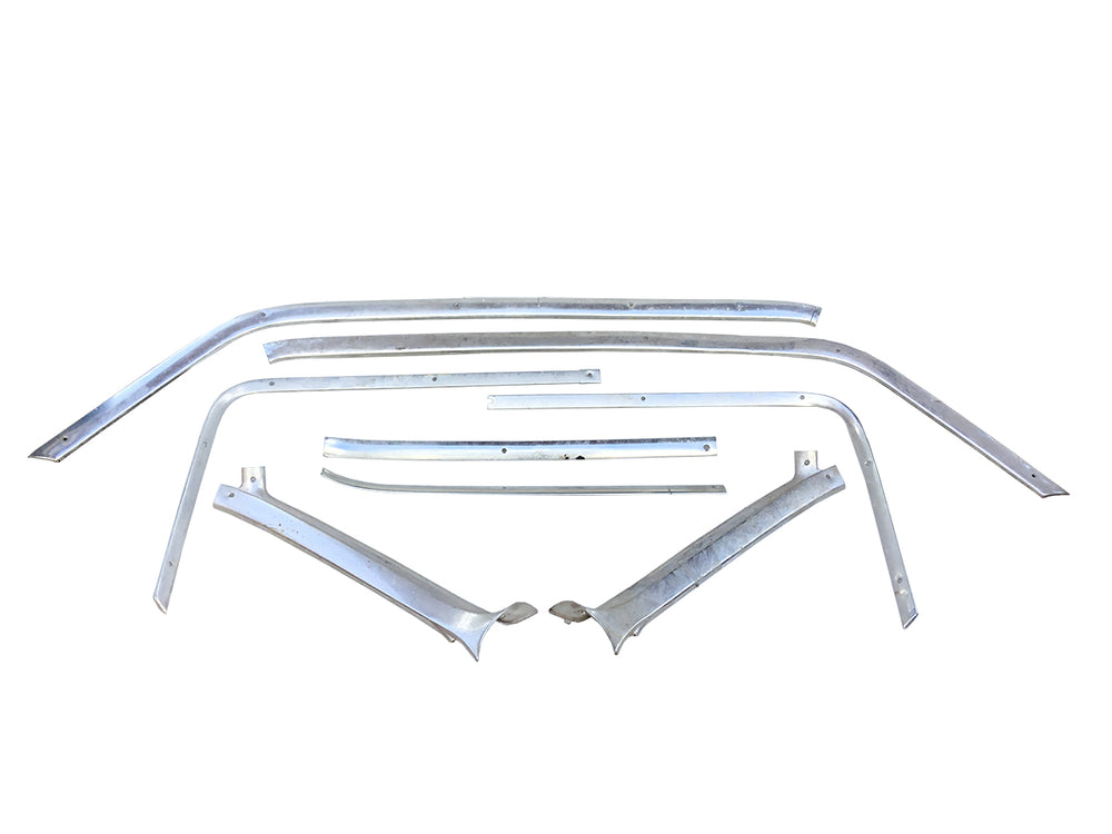 This 1963-1964 Chevy Impala 2-Door Hardtop Interior Headliner Molding Trim Set is an original used GM set. It comes complete with all the correct interior headliner trim. This is a used set and is intended to be restored by anodization or chrome plating. There will be no tears or extra holes in the aluminum but there will be some minor pitting.