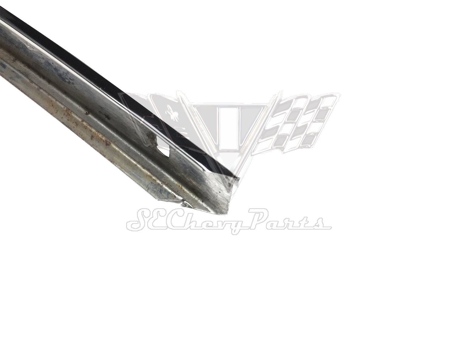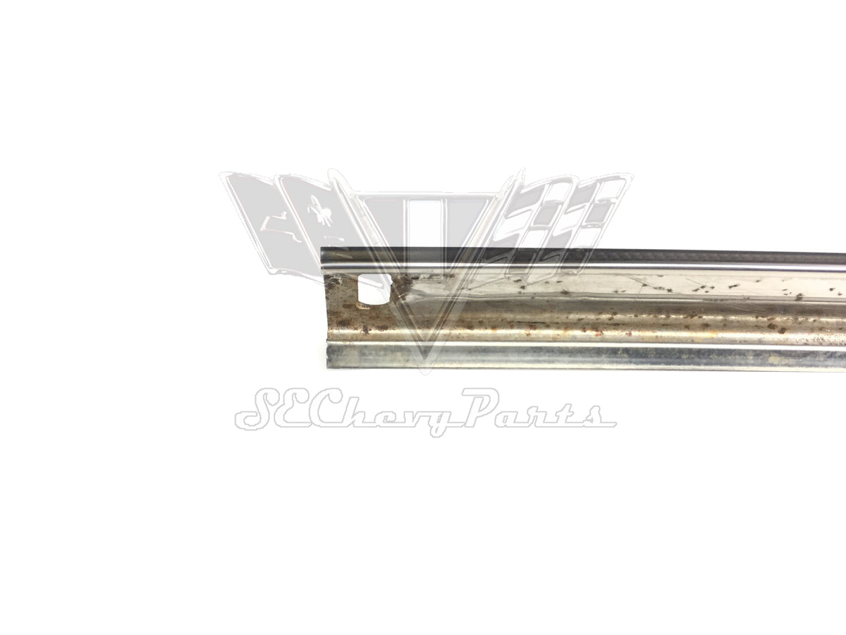 This 1963-1964 Chevy Impala 4-door Hardtop Roof Drip Rail Weatherstrip Molding LEFT REAR is an original GM part that has been show polished. The molding does not include the mounting screws.