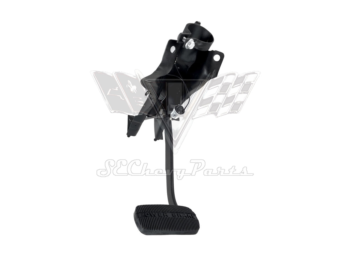 This 1963-1964 Chevy Impala Automatic Swing Pedal Power Brake Assembly is an original GM Part that has been fully RESTORED. The assembly comes with all new bushings, pads, switch, and rubber. The power brake setup is very different than the non-power brake. This assembly has no spring in the foot pedal and the brake plunger rod has an eyelet on the end to connect to the power brake booster. The power brake booster push rod is sold separately.