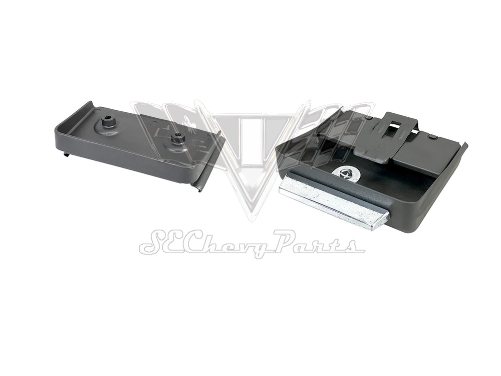 1963-1964 Chevy Impala Under Dash Ashtray w/AC is an original GM part #3820916 that has been media blasted and primed. The handle has some light pitting but there is no decay in the ashtray. The kit includes the upper plastic and mounting bracket and lower ashtray so it is a full set.