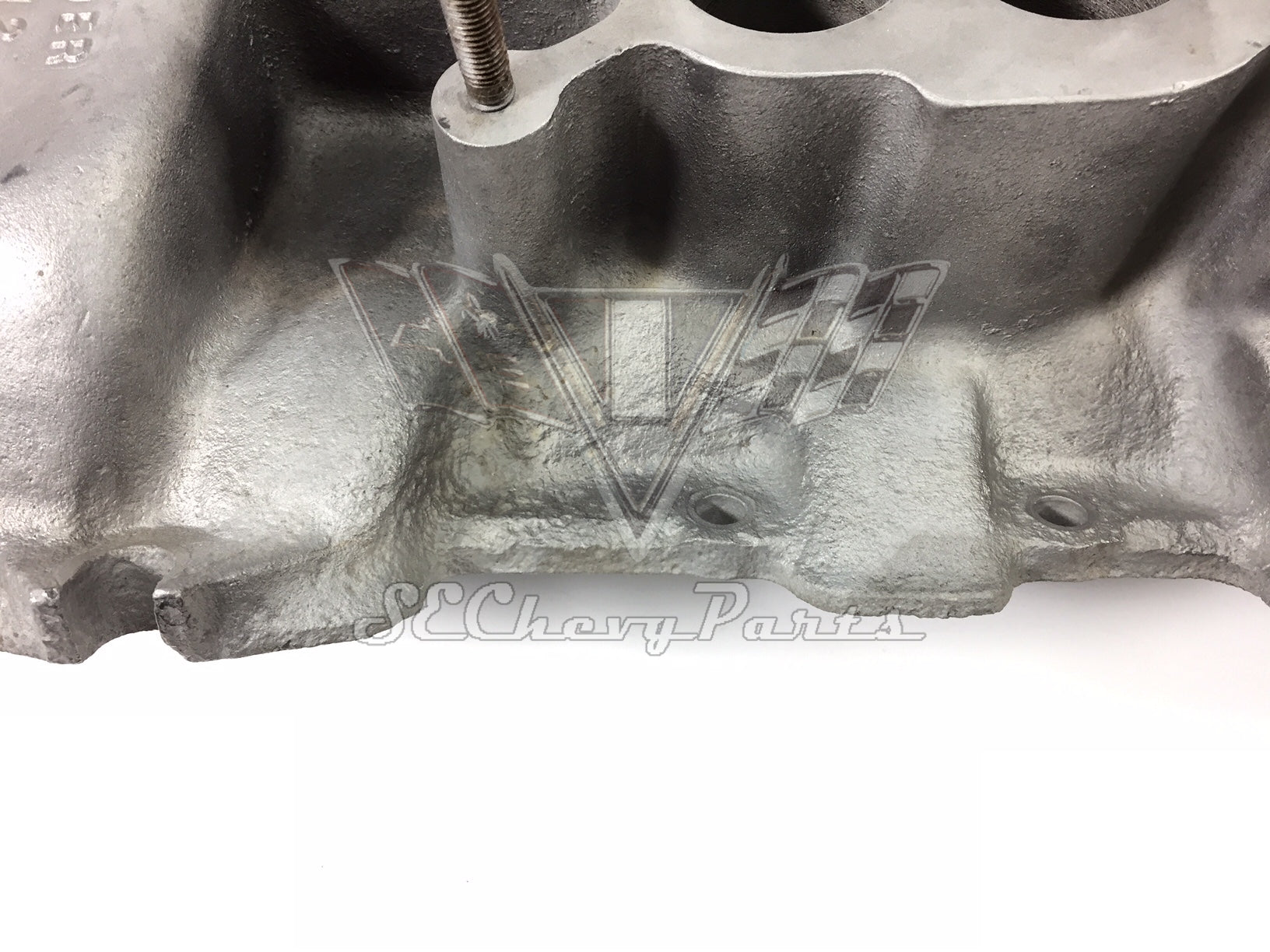 This 1963-1965 Chevy 409 400HP Carter AFB Aluminum Intake Manifold #3844463 is an original GM part. The intake has the oil baffle still riveted. The holes are good with no cracks. Threads have been chased and in good condition (one has some minor stripping but still works). There is some minor corrosion near the bolt holes (see photos).