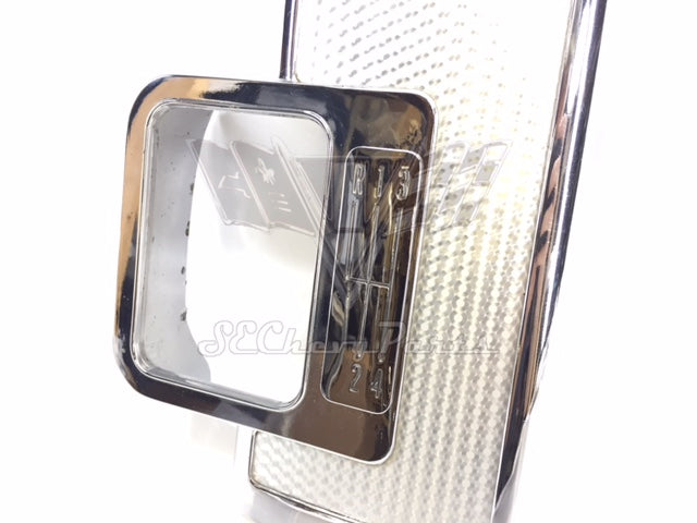 This 1963 Chevrolet Impala Super Sport OEM 4 Speed Shifter Console is an original used GM part that is in good condition.  The emblem, swirl pattern, and shift panel are in good condition.  There is some minor pitting (see photos).