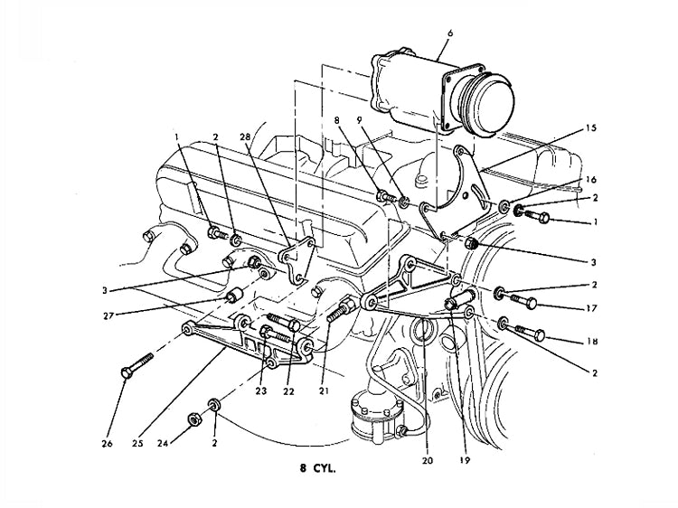 This 1964-1956-1966-1967-1968 Chevy Impala Small Block Air Conditioning Compressor Side Support Bracket is an original GM part (#3878222).  The bracket mounts to the side of the engine block (see diagram) for any small block 283, 307, 327 (NOT 396, 409).  For an additional fee we can media blast and prime the part as shown in the photo.