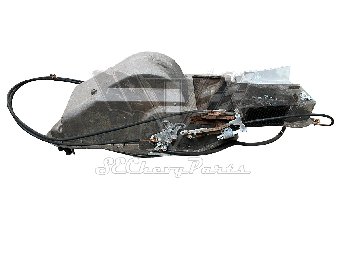 This 1965-1966 Chevy Impala Factor AC Air Conditioning Unit is a nearly complete used set. The kit comes with everything you see. There are a few items with some minor damage (see images). There is the duct work and evaporator box, under the dash box and other items. We also sell brand new a complete set of the dash bezels and vents which would nearly complete this set. It does not have the compressor as you would want a rebuilt one.