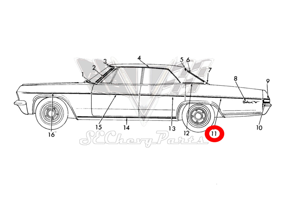 This 1965 Chevy Bel Air 4-Door Sedan Rear Quarter Molding Trim is a New Old Stock item. They are not in show condition but will have shelf wear and some minor scratches. The molding has never been installed on a car. Left and right are NOT interchangeable.
