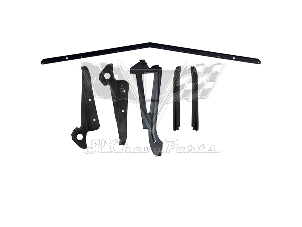 This 1965 Chevy Impala Grille Support Inner Bracket Set is an original used GM part. The set comes with all 6 pieces that support the front aluminum grille.  For an additional fee we can media blast and prime the parts as shown in the photo.