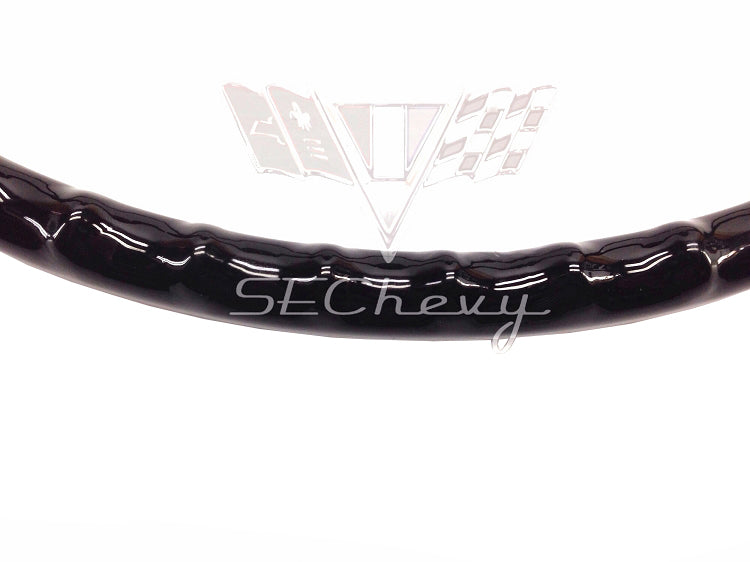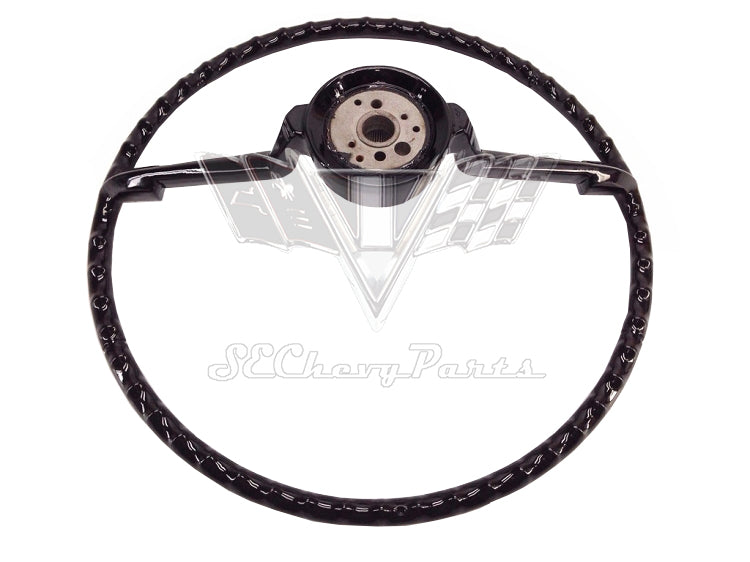 This 1965 Chevrolet Impala Steering Wheel is fully restored. We start out by checking for any warpage on your core or our core. If core is restorable we then start by checking for all cracks and filling them. The steering wheel is then primed so that you can paint it to your color.  NOTE: We do not paint the final color as it is difficult to match colors exactly.  We use the PPG concept with no bondo or lacquer used in this process.
