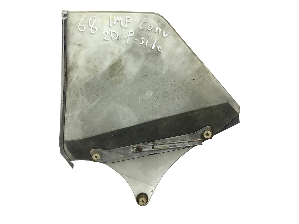 This set of 1967-1968 Chevy Impala Convertible Quarter Window Guide Tracks is an original used kit. The set includes the front and rear quarter window guide tracks along with the quarter window glass and channels.