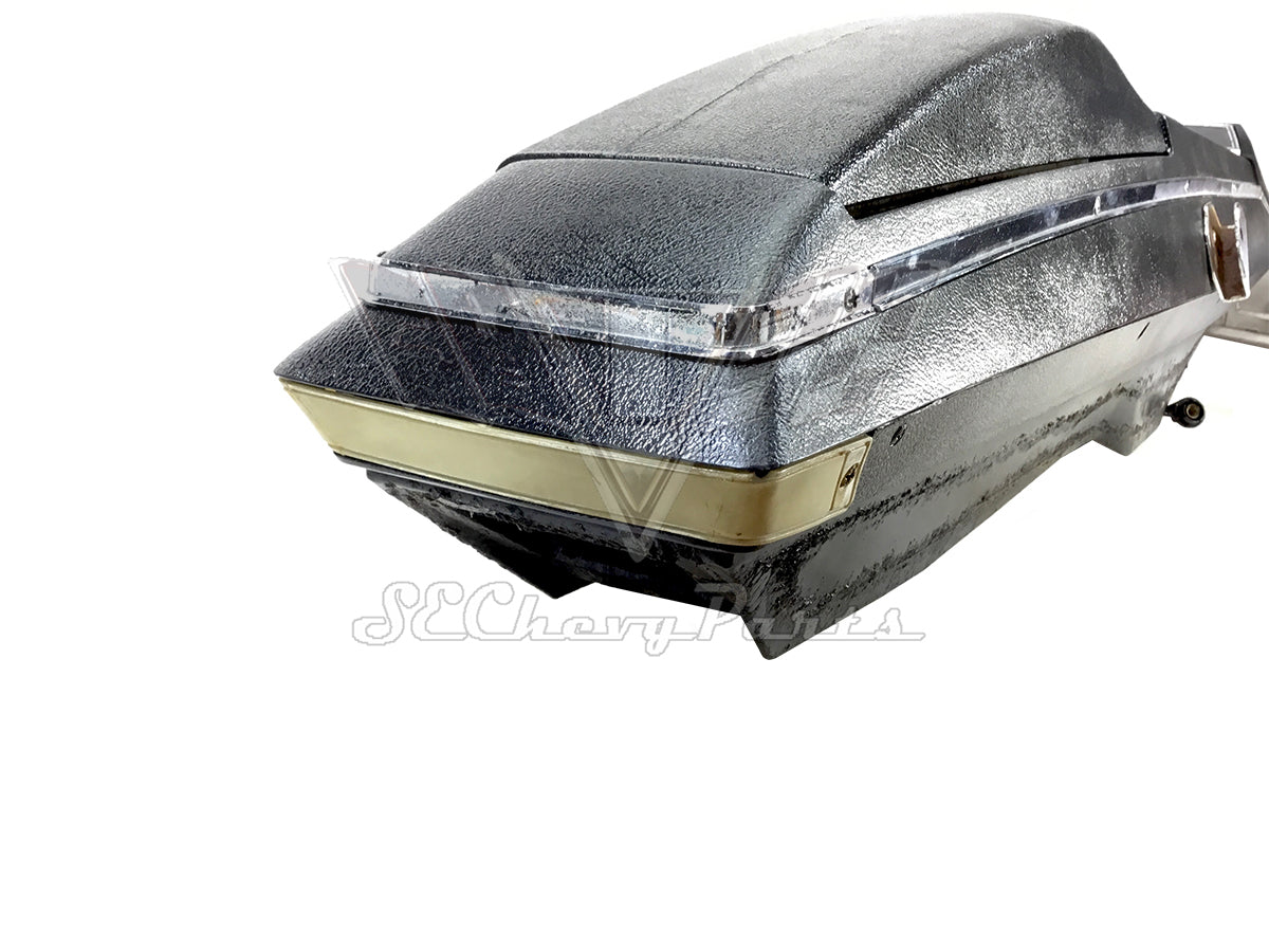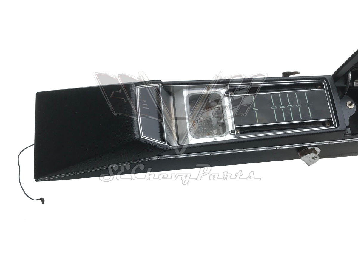 This 1968-1969 Chevy Impala Automatic Center Console is an original used GM part. The console is in excellent condition with a few flaws. There is a slight crease on the glovebox lid (see images) but it is hardly noticeable. The glovebox and ashtray lids works great. The lower console lens is not broken and the housing has no cracks. It almost looks new. The console does not include the horseshoe shift lever.
